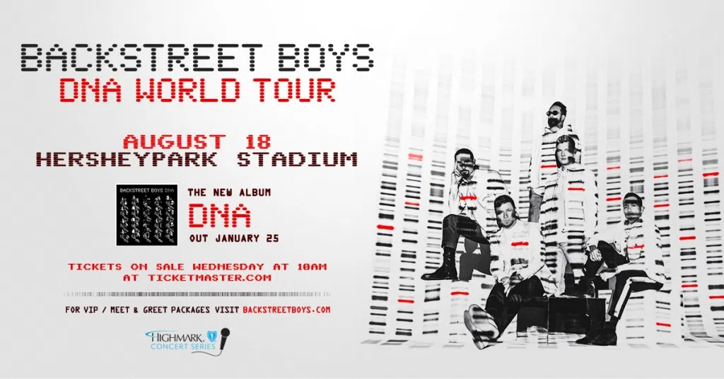 HOT 106.7 welcomes the BACKSTREET BOYS- DNA WORLD TOUR to Hersheypark Stadium on August 18, 2019Tickets go ON SALE on Wednesday, November 14th at 10 AMTickets at Ticketmaster.com